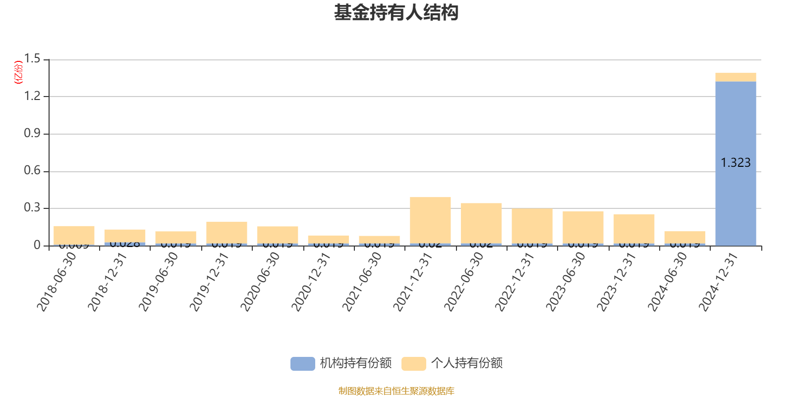 截至2024年12月31日,基金持有人共计427户,合计持有1.39亿份。其中管理人员工持有1.61万份,占比0.01%,机构持有份额占比95.04%,个人投资者占比4.96%。