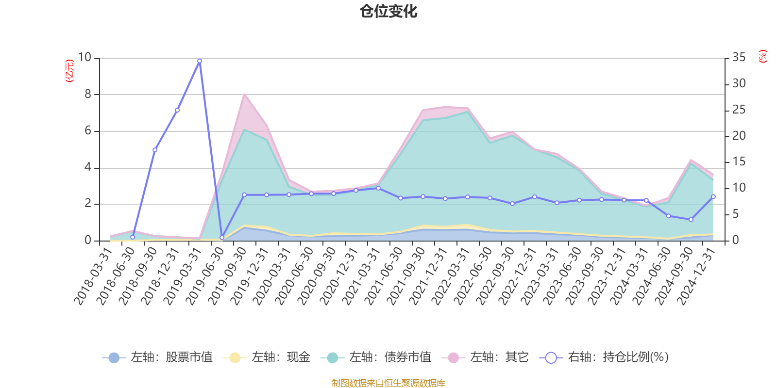 据定期报告数据统计,近三年平均股票仓位为7.34%,同类平均为18.51%。2019年一季度末基金达到34.48%的最高仓位,2019年上半年末最低,为0.62%。